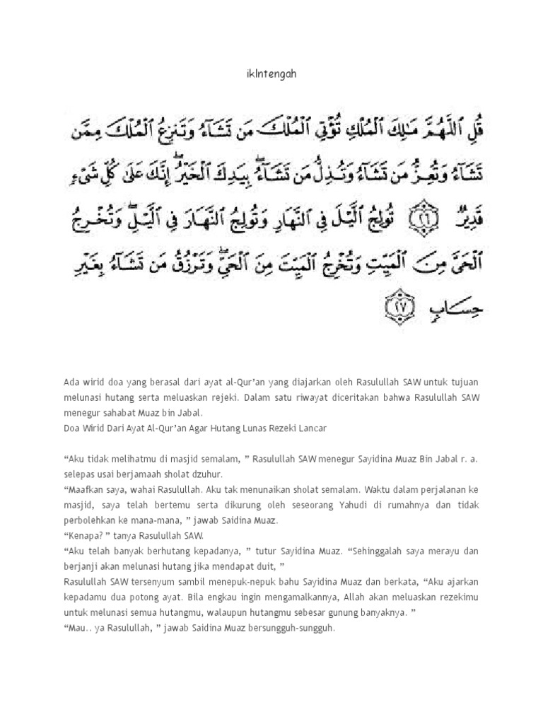 Dan engkau beri rizki siapa yang engkau kehendaki tanpa hisab (batas). Maka ada beberapa kasus yang mungkin saja masih berkutat dengan kurangnya pendapatan, sehingga cara yang ditempuh pun beragam. Dua ayat yang diajarkan rasulullah agar hutang cepat lunas itu adalah sebagai berikut: Aku ajarkan kepadamu dua potong ayat. Sayangnya ada sebagian golongan yang menganggap bahwa doa yang dikarang oleh para ulama' dianggap menyimpang.