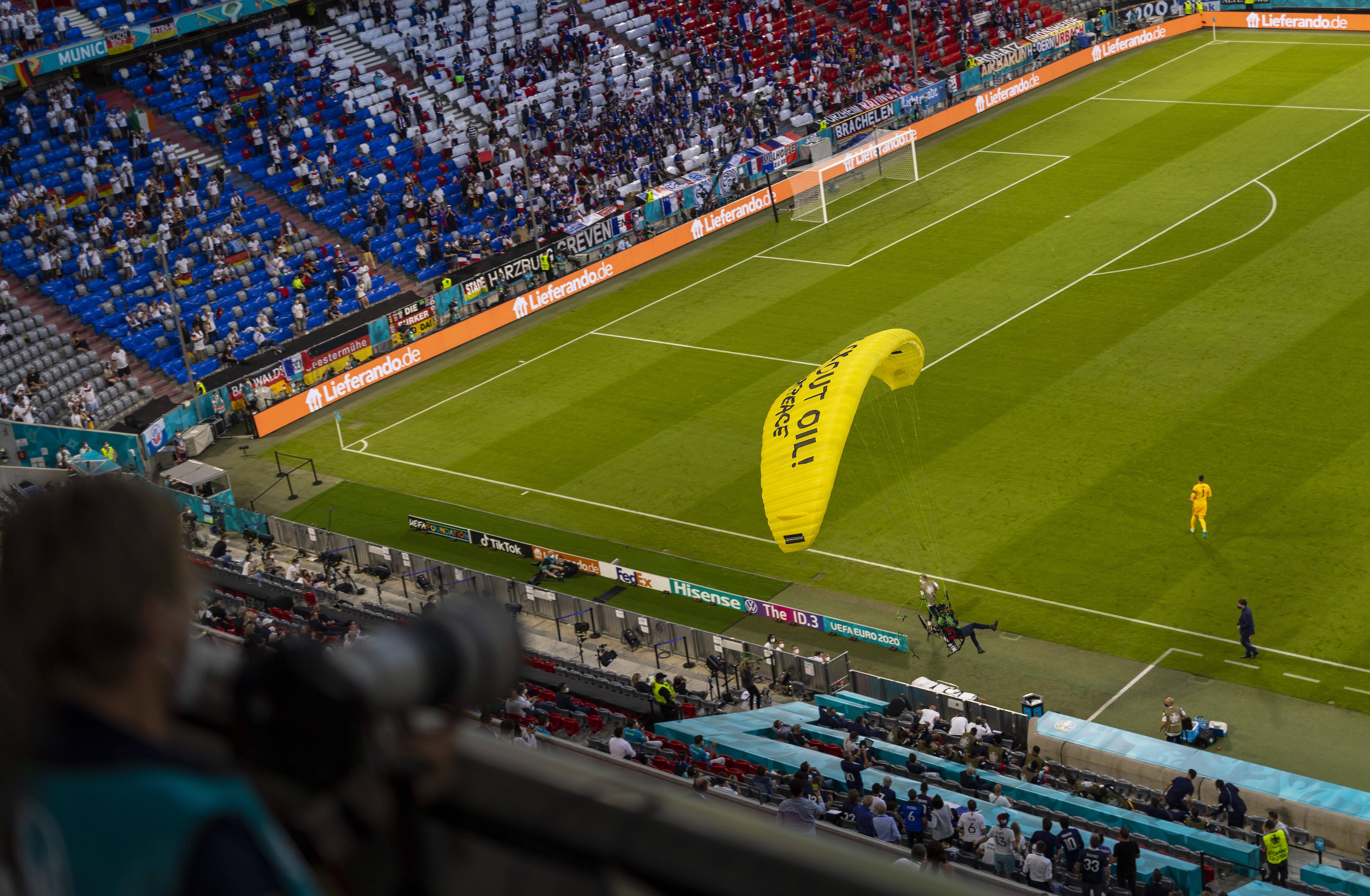 A greenpeace protester parachuted into the allianz arena before france's game against germany at the euros.